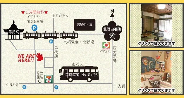 - 市バス50番(B2のりば、立命館大学前ゆき)で、『北野白梅町』下車。その後、徒歩約6分。